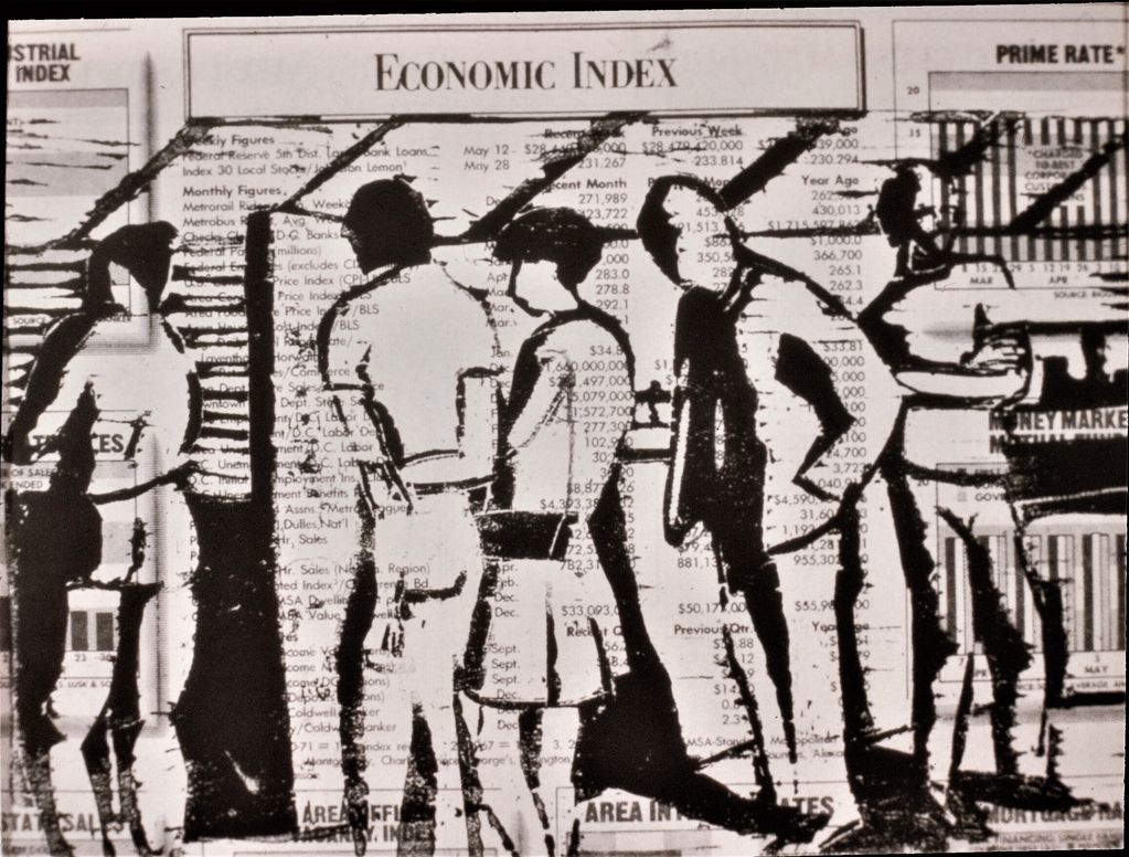 ThE LINE- Economic Index, block print on newspaper.